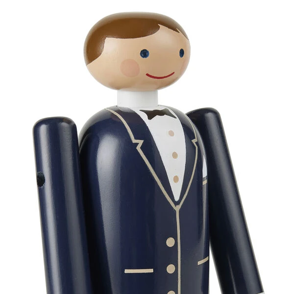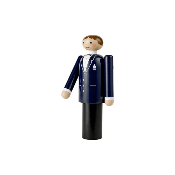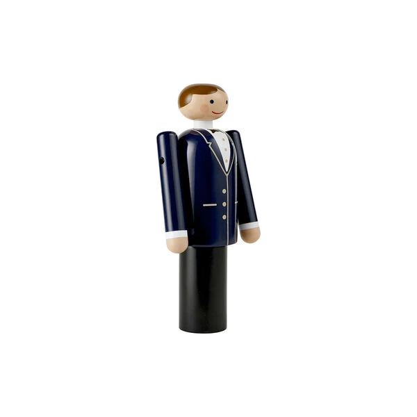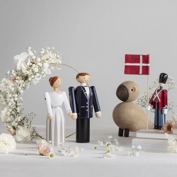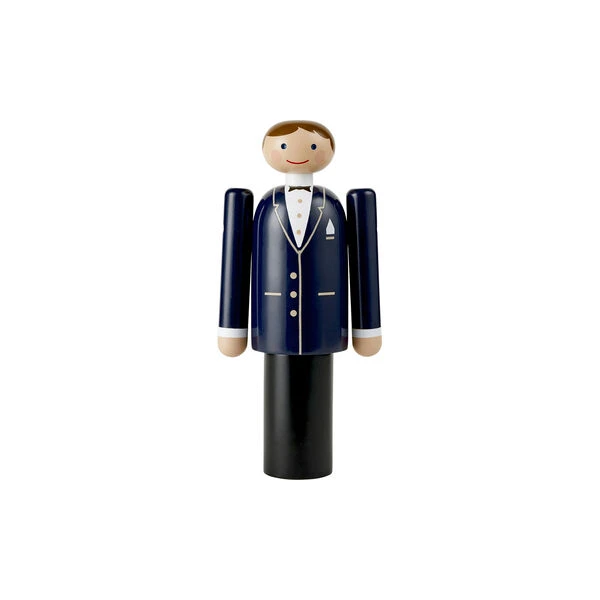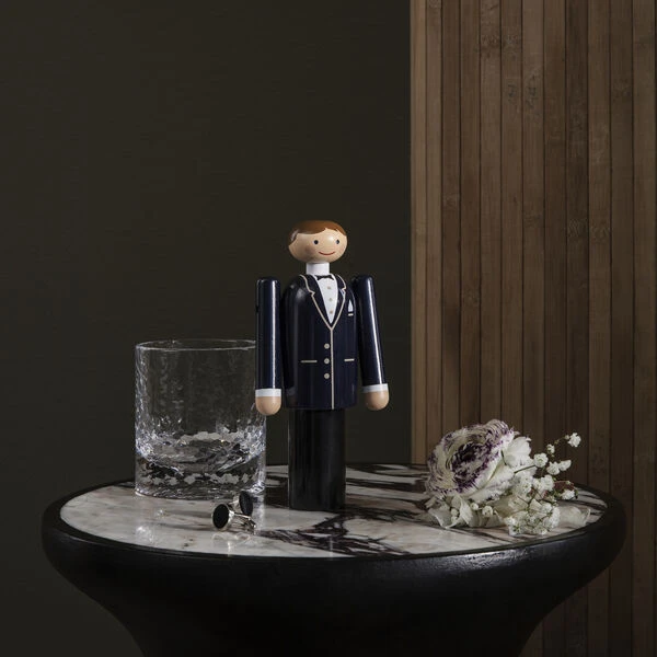 Kay Bojesens Groom er originalt og klassisk dansk trehåndverk på sitt beste – designet i Bojesens ikoniske runde former med et velkjent glimt i øyet. Groom måler 18 cm og er elegant kledd i en mørk dress med hvit skjorte og svart sløyfe. Omhyggelige detaljer som knapper, lommetørkle og slag gjør jakken levende, og brudgommens glade og imøtekommende smil gir ham sjarm og personlighet. Formen på brudgommen er basert på de originale figurene fra arkivene, som er enkle og minimalistiske, men fulle av hjerte og sjel. Figuren er laget av FSC-sertifisert bøk og laget i samme høye kvalitet som Kay Bojesens trefigurer er kjent for. Gi Groom som gave på det kommende utdrikningslaget, eller la den elegante figuren finne veien til gavebordet sammen med Grooms utvalgte partner.