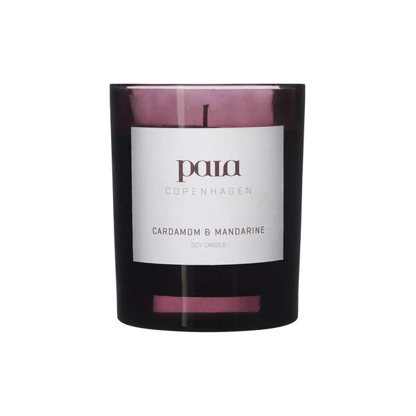 Cardamom & Mandarine duftlys i glass med økologisk dyrket soyavoks og økologisk bomullsveke fra Paia Copenhagen. Farge: lilla. Inneholder: 300g Brennetimer: opptil 60 timer. Duft: kardemomme og mandarin.