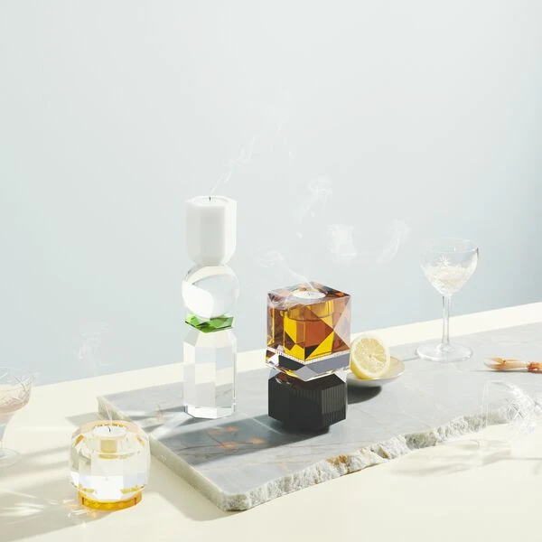 Dakota telysholder i håndslipt krystall fra Reflections Copenhagen. Farge: amber/clear/black. Mål: H: 16,5 x B: 9 x D: 9 cm. Design: Julie Hugau & Andrea Larsson.