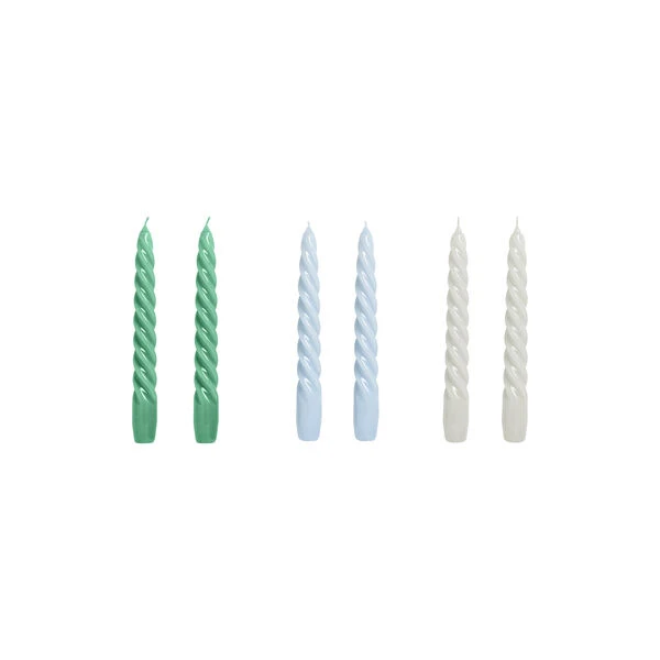 Spiral stearinlyssett i fra HAY. Farge: green light blue light grey. Mål: H: 19 x Ø 2,6 cm. Antall: 6 stk. Brennetid: 6 timer.