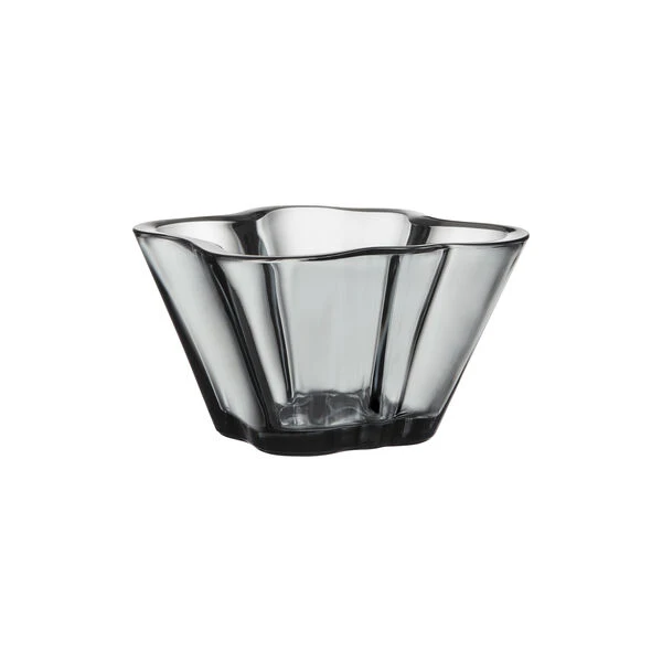 Alvar Aalto skål i munnblåst glass fra Iittala. Farge: grå. H: 7,5 cm. Design: Alvar Aalto.