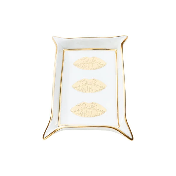 Lips Valet fat i porselen fra Jonathan Adler. Farge: hvit/gull. Mål: L: 12,5 x B: 18 cm.