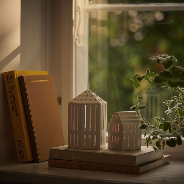 Urbania is a beautiful and modern Christmas collection from Kähler, merging a stringent expression with the warm sensations from the tealight candle. Bache and Bendix Becker head up a collection of candle houses, which are closed tealight candle holders in white faience. Here, you have Candle House Galleri, measuring 17 centimetres. This candle house is available as a modern addition to Christmas traditions and is the perfect match for any home. The small holes in the candle house help create a playful light, revealing the tealight candle’s warmth and light. Use them either together or separately.