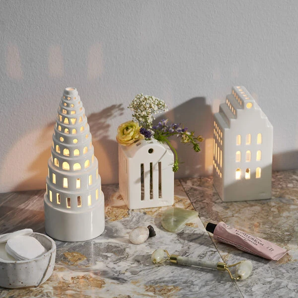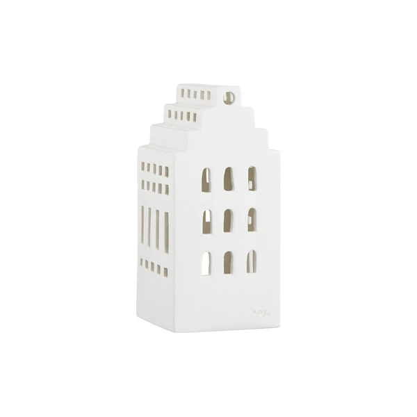 Urbania lyshus herregård i porselen fra Kähler. Farge: hvit. Mål: H: 17 x B: 8 cm. Design: Mette Bache og Barbara Bendix Becker.
