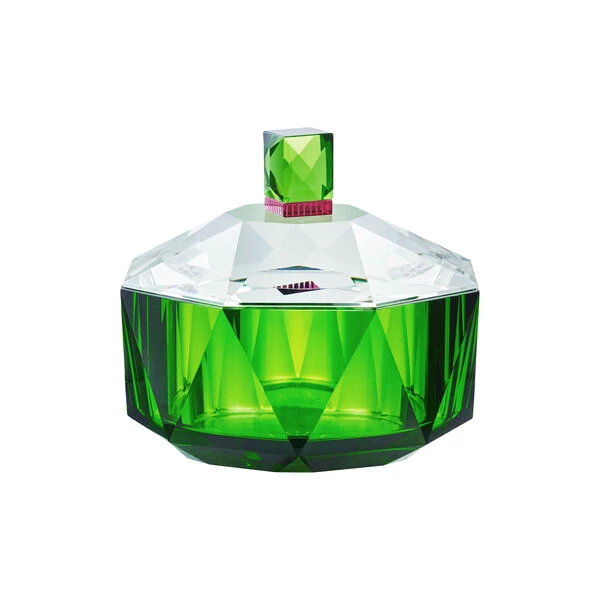 Denne overdådige fargede krukken med lokk er laget av krystall og er gjengitt med et åttekantet lokk. Den vil bringe liv til ethvert rom med sin romantiske, men dristige fargekombinasjon. Ideelt plassert på et sminkebord, skrivebord eller bordplate, kan denne vasken brukes til å oppbevare smykker, nøkler eller andre små pyntegjenstander. Mål: H: 12 x Ø 13 cm.