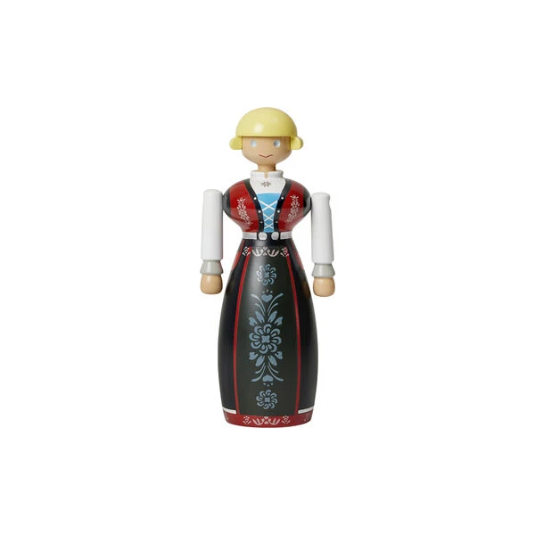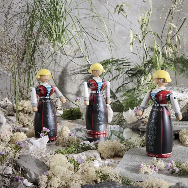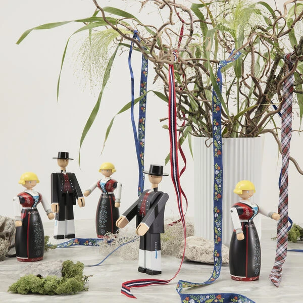 17. mai er en gledens dag med feiringer over hele Norge, og med sine smilende linjer er Kay Bojesens Bunadsfigurer perfekte å sette på bordet på nasjonaldagen – eller ved andre festlige anledninger med venner og familie. Bunad er inspirert av den tradisjonelle norske bunadsdrakten med sine mange forskjellige variasjoner over hele Norge, representerer Bunad Kvinne Norge som helhet. Hun har en hvit skjorte under den gulvlange stakken, som er rikt dekorert med broderier, sølvdetaljer og belte i midjen. Både kvinnens form og frisyre er Kay Bojesens originale design fra arkivene. Den kvinnelige Bunad-figuren måler 16 cm, er dreid i FSC-sertifisert bøk og er laget i det høykvalitets håndverket som er typisk for alle Kay Bojesens trefigurer.