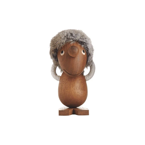Optimist trefigur i håndlaget teak med hår i kaninpels fra Architectmade. Mål: H: 11,5 cm. Design: Hans Bølling.