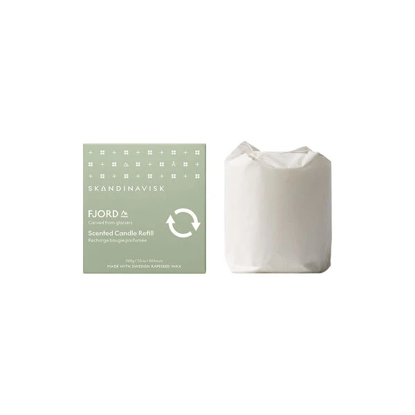 FJORD Scented Candle Refill by Skandinavisk. Colour: white. Dimensions: H: 8 x Ø 7.6 cm. Contains: 200 g. Scent notes: Apple and pear blossom, orchard fruits and redcurrants.