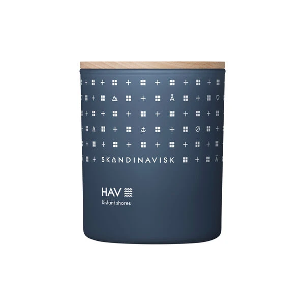 HAV duftlys fra Skandinavisk. Farge: blå. Mål: H: 9,9 x Ø 7,9 cm. Inneholder: 200 g. Brennetid: 50 timer. Duft: saltvann, tang, hagtorn og strandroser.