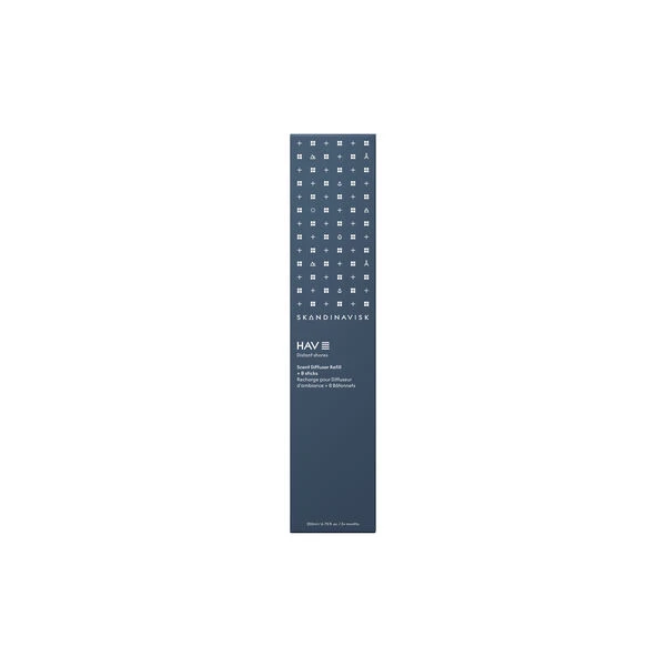 HAV romduft refill fra Skandinavisk. Farge: blå. Mål: H: 14,5 x Ø 4,8 cm. Inneholder: 200 ml. Duft: saltvann, tang, hagtorn og strandroser.