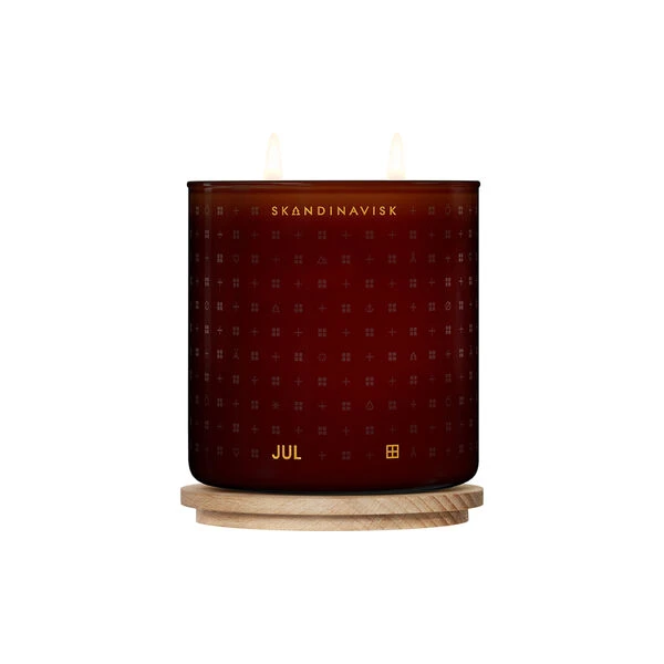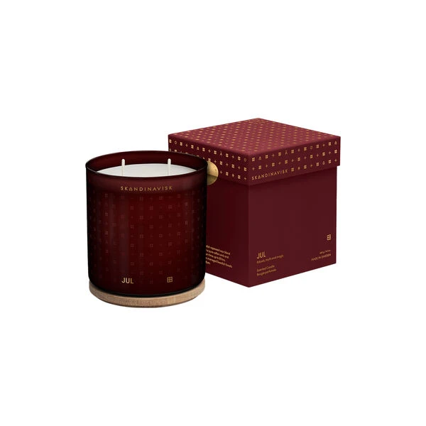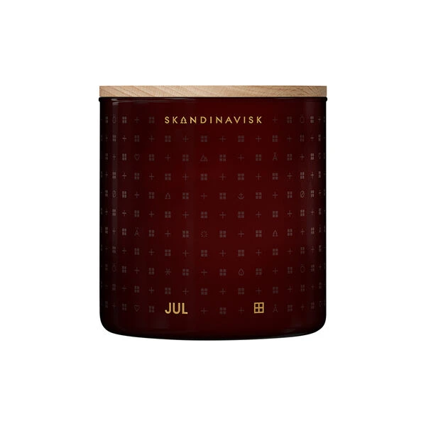 JUL duftlys i svensk rapsfrøvoks og FSC-sertifisert graverte lokk i eik fra Skandinavisk. Farge: merlot red. Duft: pepperkaker krydret med appelsin og gløgg. Inneholder: 90g.