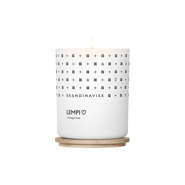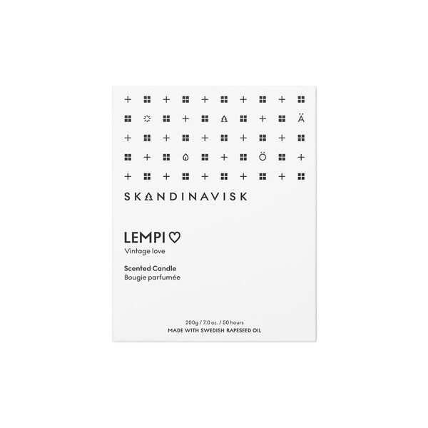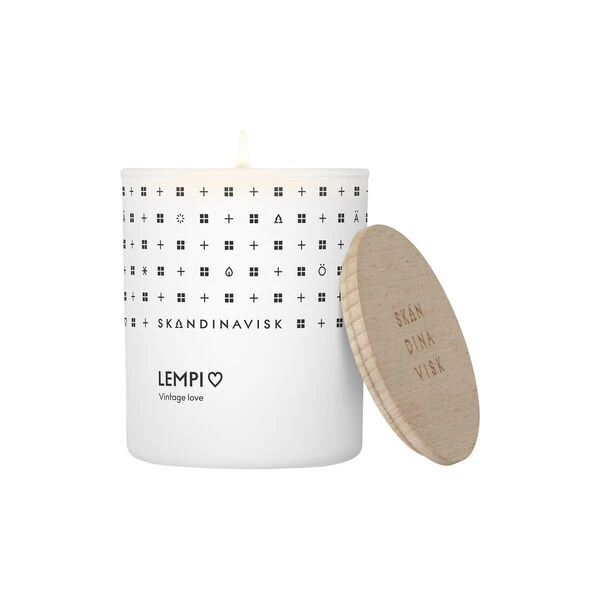 LEMPI duftlys fra Skandinavisk. Farge: hvit. Mål: H: 9,9 x Ø 7,9 cm. Inneholder: 200 g. Brennetid: 50 timer. Duft: peoner, roser, jordbær og mose.