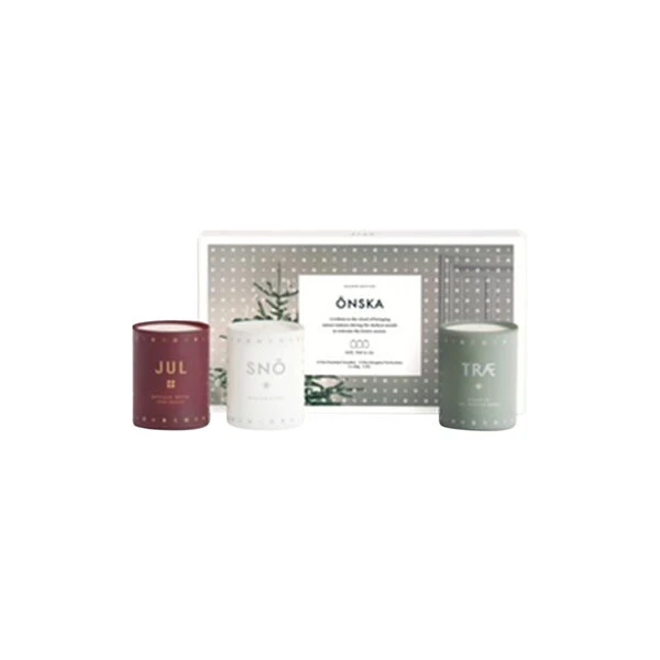 Gavesett JUL, SNÖ, TRAE mini duftlys. Brennetid: 3×16 timer. Made in France.