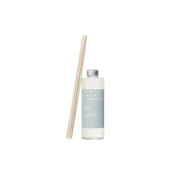 ØY romduft refill fra Skandinavisk. Farge: lyseblå. Mål: H: 14,5 x Ø 4,8 cm. Inneholder: 200 ml. Inneholder nye duftpinner. Duft: villeple, hunderose, kildemose og grønne blader.