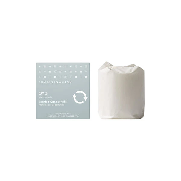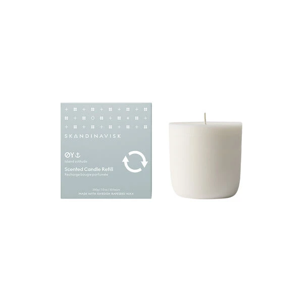ØY Scented Candle Refill by Skandinavisk. Colour: white. Dimensions: H: 8 x Ø 7.6 cm. Contains: 200 g. Scent notes: Crabapple and dog rose, water mosses and green leaves.