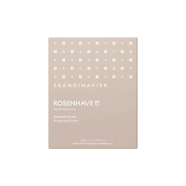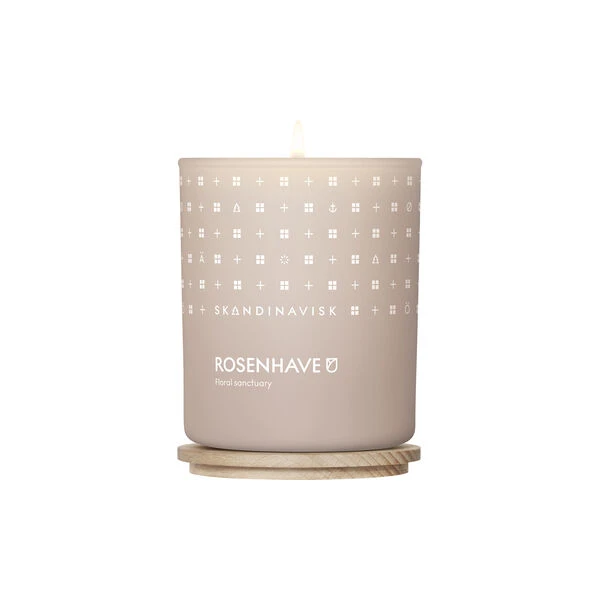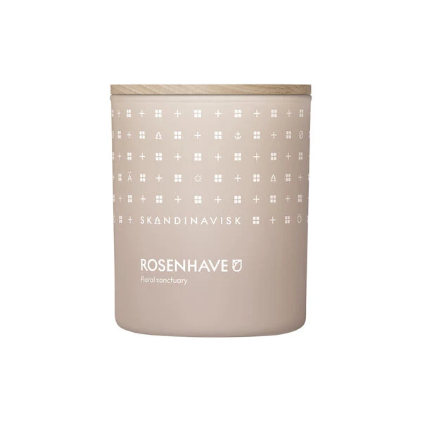 ROSENHAVE duftlys fra Skandinavisk. Farge: rosa. Mål: H: 9,9 x Ø 7,9 cm. Inneholder: 200 g. Brennetid: 50 timer. Duft: buskrose, hylleblomst, storkenebb og solbær.