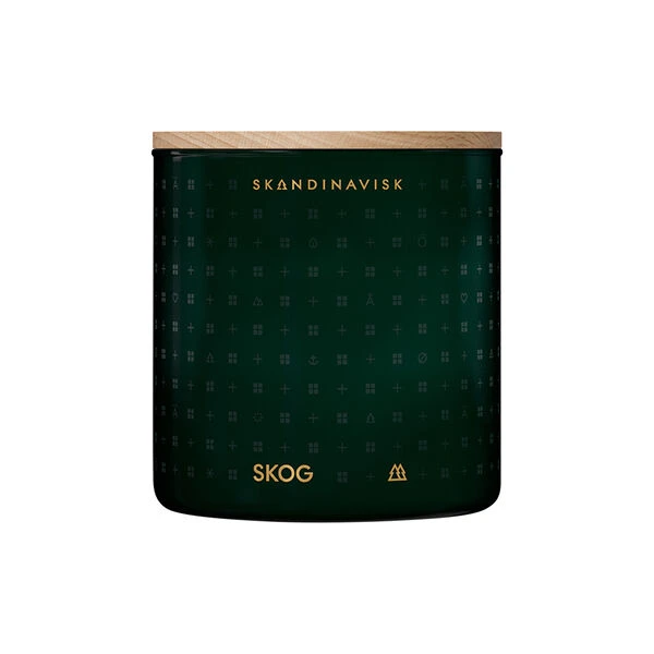 SKOG duftlys i svensk rapsfrøvoks og FSC-sertifisert graverte lokk i eik fra Skandinavisk. Farge: forest green. Duft: furunål og grankongler med bjørkesevje og lilje. Inneholder: 400 g.