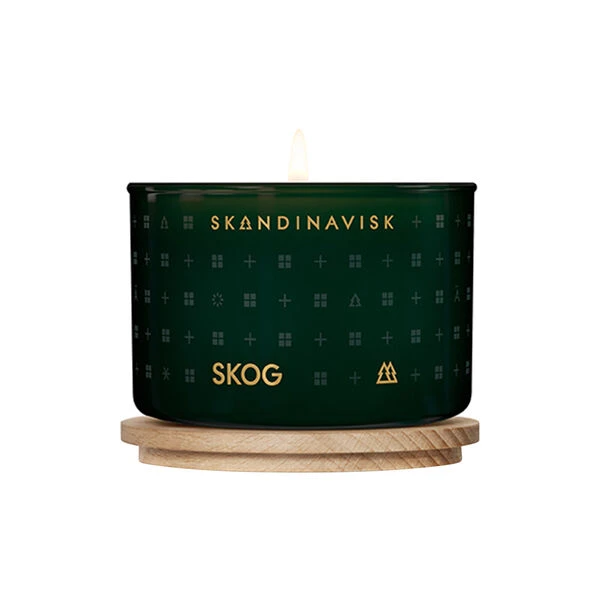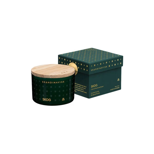 SKOG duftlys i svensk rapsfrøvoks og FSC-sertifisert graverte lokk i eik fra Skandinavisk. Farge: forest green. Duft: furunål og grankongler med bjørkesevje og lilje. Inneholder: 90g.