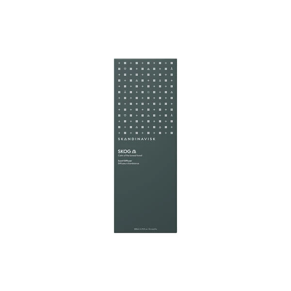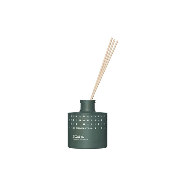 SKOG romduft fra Skandinavisk. Farge: grønn. Mål: H: 8 x Ø 9,8 cm. Inneholder: 200 ml. Duft: furunåler, grankongler, bjørkesaft og lillekonval.