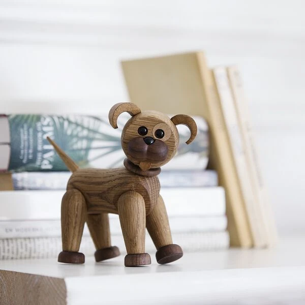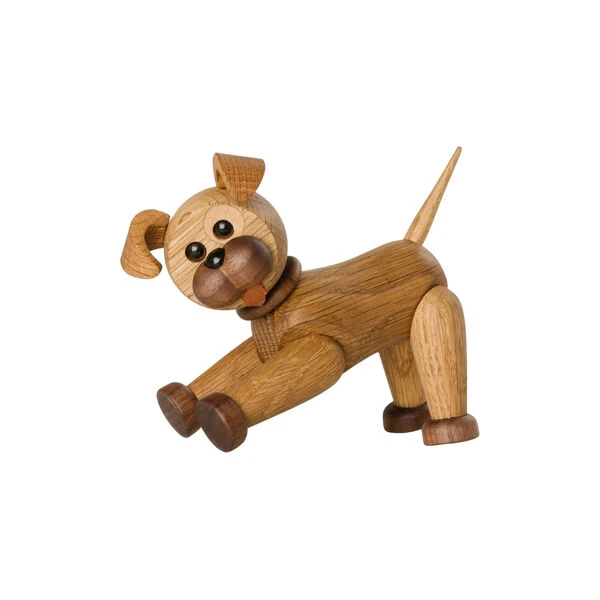Happy er en hyllest til menneskets beste venn. Den er laget av eik, valnøtt og ask – og det brukes okseskinn til tungen. Som med Chrestens Sommers øvrige design, er det lagt vekt på å gjøre Happys uttrykk søtt, mildt og foranderlig. Derfor består Happy av 31 deler som du kontinuerlig kan bevege og snu, og hunden kan legge seg ned, reise seg, sette seg ned og mye mer. Designet gjør det mulig å skape nye uttrykk, derfor får du med Happy ikke bare en ny bestevenn, men også et design som du kontinuerlig kan personalisere, slik at uttrykket blir unikt for ditt hjem.