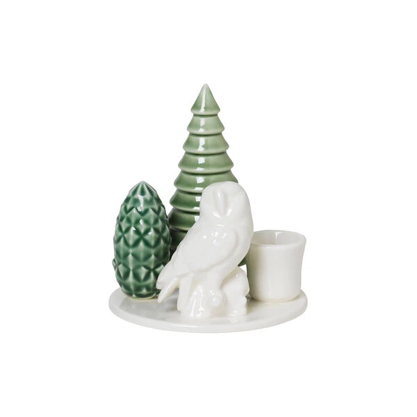 Lysestake med ugle og to trær. Bruk kronlys. Vinterhistorier er små magiske fortellinger om det spesielle lyset og landskapet i nord. De bringer varme og hygge til de mørke vinterdagene.